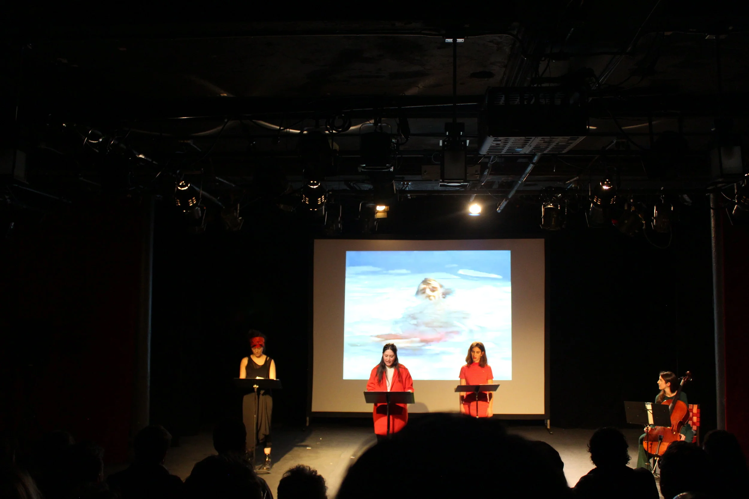 Playwright: Leonardo González / Director: Stefania Burbarella / Actors: Elisa Alemparte, Delfina Viaggio, Zafi Dimitropoulou / Live music Cello: Dulce Lamarca / Light Design and Projections: Ana Minujin