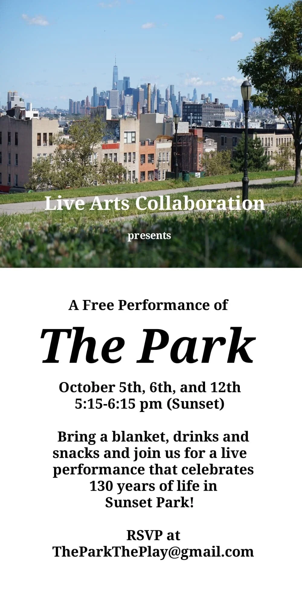 Live Arts Collaboration Presents The Park The Play, a free collaborative performance in Sunset Park. Bring a blanket, drinks and snacks.